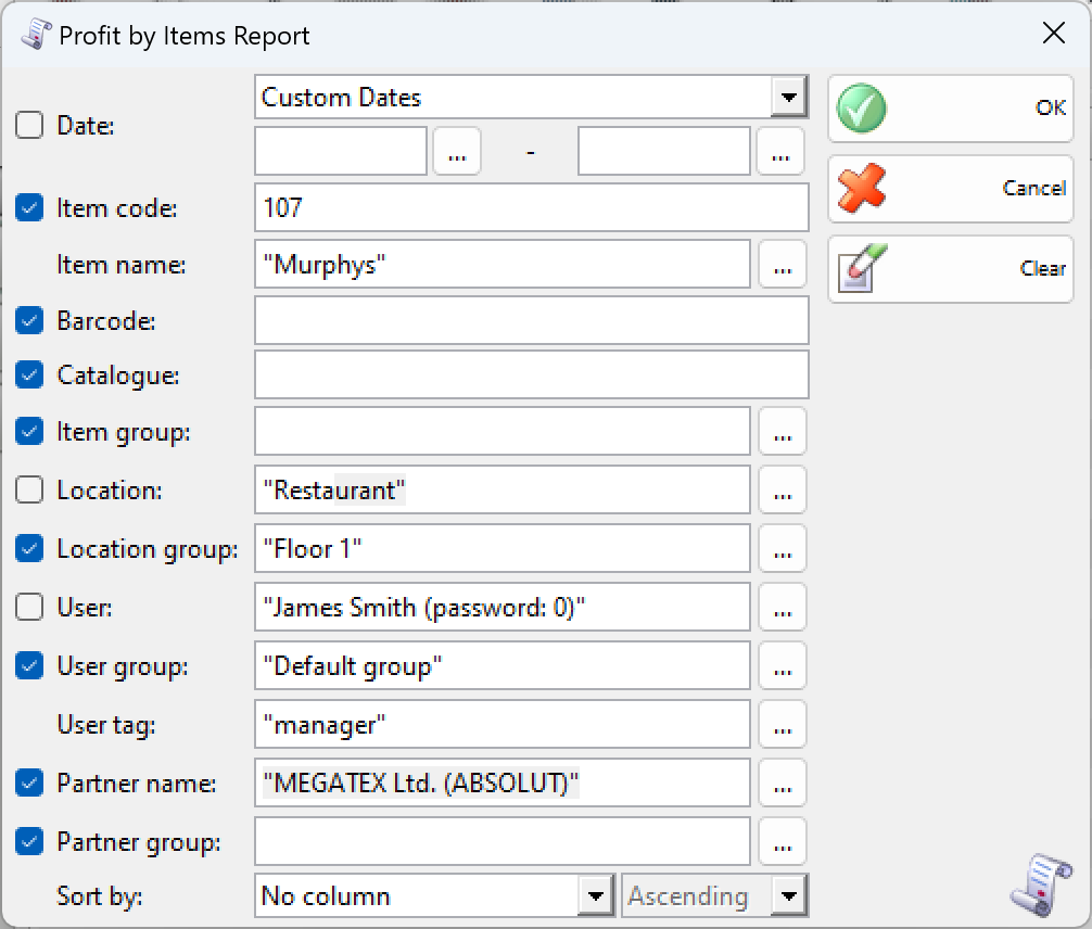 You can limit the report to a single criterion. For example, you can visualize the profit of a particular item. You can also apply several criteria at a time – for example, visualize the profit for a specific partner and for a specific period of time.